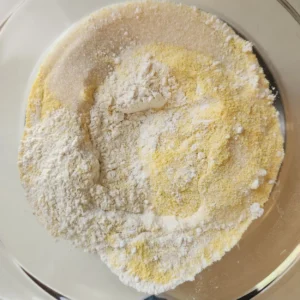 Step 1: Preheat your oven to 400 degrees. Combine all dry ingredients in a mixing bowl. Corn meal, flour, baking powder, sugar, and salt.