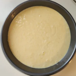 Step 2: Once combined, mix in the plant-based milk and the canola oil. Pour the batter into a greased cake pan, or use a lined cupcake tray for cupcake sized cornbread bites.
